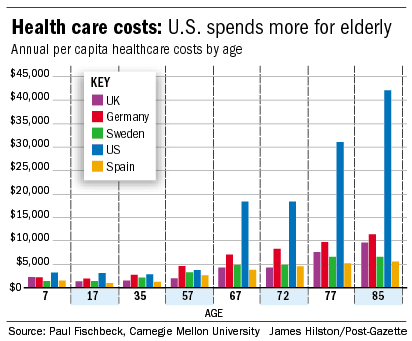 Yhdysvalloissa Medicare kustantaa terveydenhoidon yli 65-vuotiaille. Siksi heidän terveydenhoitoonsa kuluu 3-8 kertaa enemmän rahaa kuin Britannian, Saksan, Espanjan ja Ruotsin senioreihin. Työikäisiin käytetään rahaa saman verran kuin muissa länsimaissa. Vanhusten runsas, tuskallinen tehohoito kuoleman alla on moninkertaista, hyvin kallista ja usein hyödytöntä.
